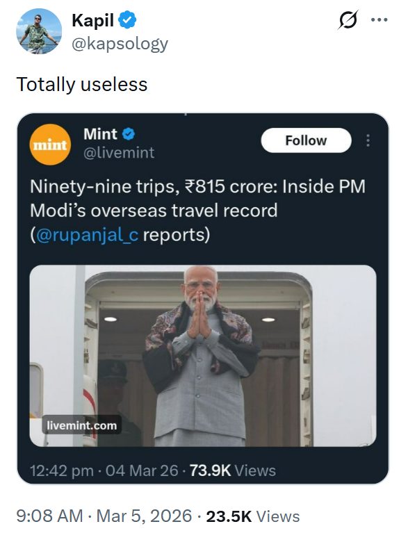 Yet recent blocking orders point to a clear departure from this stated intent. The crackdown has not been limited to high-profile voices; even ordinary users engaging in political criticism and satire are being targeted. On March 5, for instance, a user named Kapil posted a screenshot of a news report on expenditure related to the Prime Minister’s foreign visits, calling it “totally useless.” That two-word remark, too, was withheld in India following a government directive.