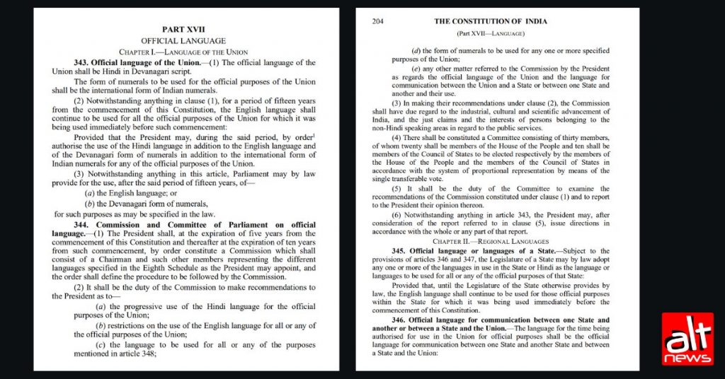 Part XVII of the Constitution of India, which comprises Articles 343 to 351, contains the relevant provisions. Article 343 says, “The official language of the Union shall be Hindi in Devanagari script. The form of numerals to be used for the official purposes of the Union shall be the international form of Indian numerals.