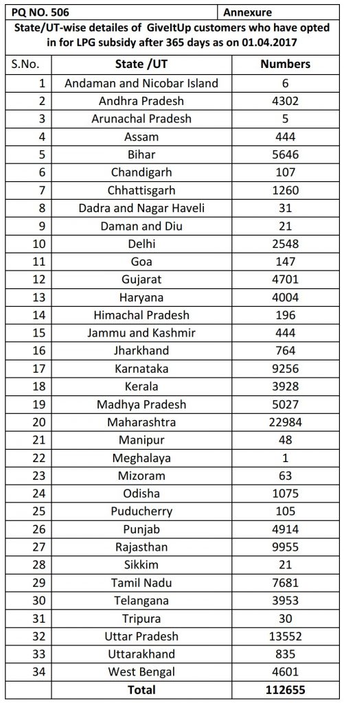 उपर्युक्त प्रश्न का उत्तर देने की समय सीमा 10 अप्रैल तक थी. श्री धर्मेंद्र प्रधान ने प्रश्न का उत्तर देते हुए कहा थे की “सभी एलपीजी उपभोक्ता जिन्होंने स्वेच्छा से अपनी सब्सिडी का लाभ उठाने से मना कर दिया था,के पास एक वर्ष के पश्चात वापस अपनी सब्सिडी का लाभ उठाने का विकल्प मौजूद है”. उत्तर के अगले हिस्से में उन लोगो की संख्या का राज्यवार ब्यौरा दिया गया था जिन्होंने अपनी सब्सिडी छोड़ दी थी लेकिन बाद में फिर से उसका लाभ उठाने लगे थे नीचे दिए गए आंकड़े १ अप्रैल तक उपलब्ध संख्याओं पर आधारित है.