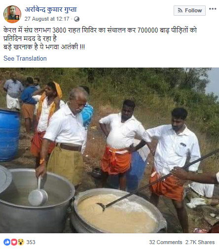 “केरल में संघ लगभग 3800 राहत शिविर का संचालन कर 700000 बाढ़ पीड़ितों को प्रतिदिन मदद दे रहा है। बड़े खरनाक हैं ये भगवा आतंकी !!!” केरल के बाढ़ पीड़ितों को राहत सहायता प्रदान करती हुई कथित रूप से आरएसएस कार्यकर्ताओं की तस्वीर के साथ सोशल मीडिया पर यह संदेश वायरल हुआ है।