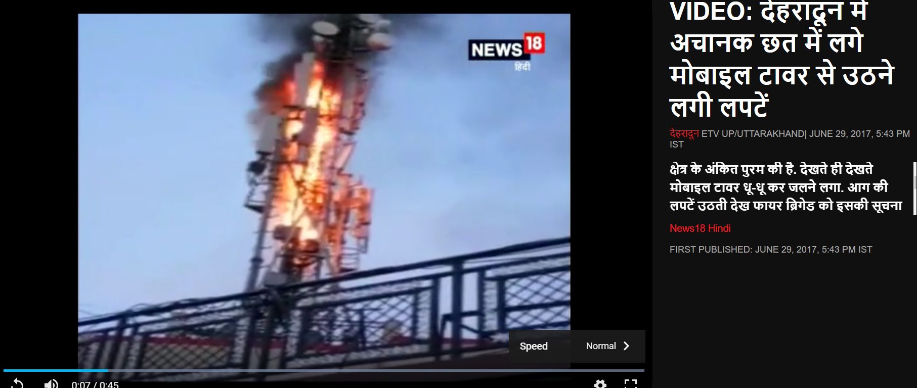 वीडियो के फ़्रेम्स को रिवर्स इमेज सर्च करने पर 28 जून 2017 की अमर उजाला की रिपोर्ट मिली. रिपोर्ट में इस घटना को देहरादून की बताया गया है. इस रिपोर्ट में टॉवर की कुछ तस्वीरें भी शेयर की गई है. रिपोर्ट के मुताबिक, “जीएमएस रोड स्थित अंकितपुरम निवासी शक्ति कुमार मेहता के घर की छत पर मोबाइल का टॉवर लगा है. टॉवर में बुधवार सुबह करीब पांच बजे आग लग गई. थोड़ी ही देर में आग की लपटें आसमान छूने लगीं. टॉवर में आग लगी देख शक्ति कुमार और आसपास के लोग घरों से बाहर निकल आए. टॉवर गिरने की आशंका से आसपास के लोगों में दहशत रही. लोगों ने इसकी सूचना फायर स्टेशन को दी. मौके पर पहुंचे दमकल वाहनों की मदद से आग बुझाई गई. दमकल विभाग के मुताबिक आग शॉर्ट सर्किट की वजह से लगी है.”