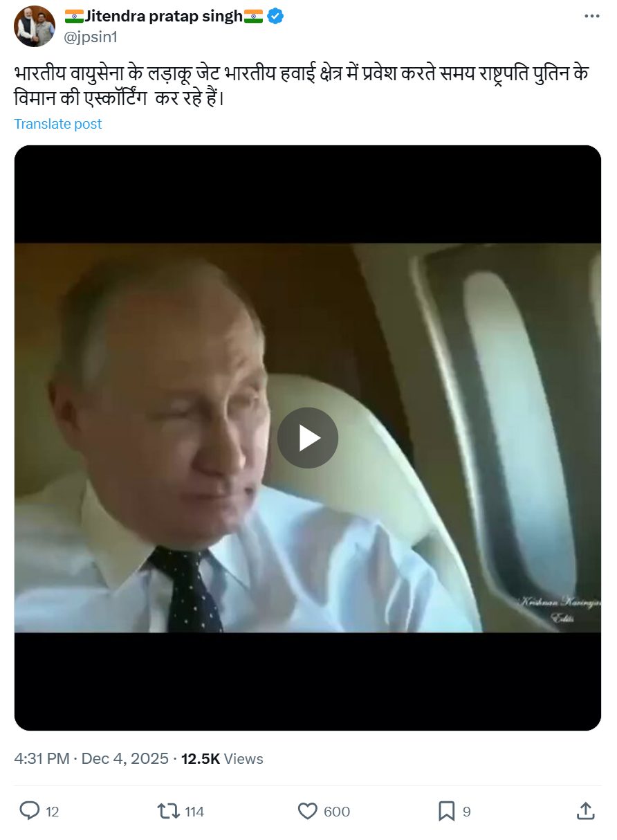 झारखंड मुक्ति मोर्चा के जनरल सेकेरेट्री मिथिलेश कुमार ठाकुर ने ये वीडियो शेयर करते हुए लिखा, “भारतीय वायुसेना के फाइटर जेट्स ने राष्ट्रपति पुतिन के विमान को भारतीय आकाश में एस्कॉर्ट किया। भरोसे, साझेदारी और दशकों पुरानी मित्रता का शानदार प्रतीक.”