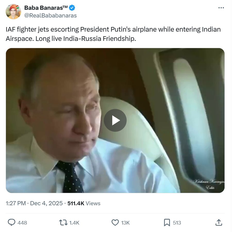 सोशल मीडिया प्लेटफ़ॉर्म एक्स पर अक्सर गलत जानकारी फैलाते हुए पाए जाने वाले यूज़र @RealBababanaras ने वीडियो शेयर करते हुए लिखा कि भारतीय एयरस्पेस में घुसते समय भारतीय वायु सेना के फाइटर जेट्स ने रूस के राष्ट्रपति पुतिन के विमान को एस्कॉर्ट कर रहे हैं. (आर्काइव लिंक)