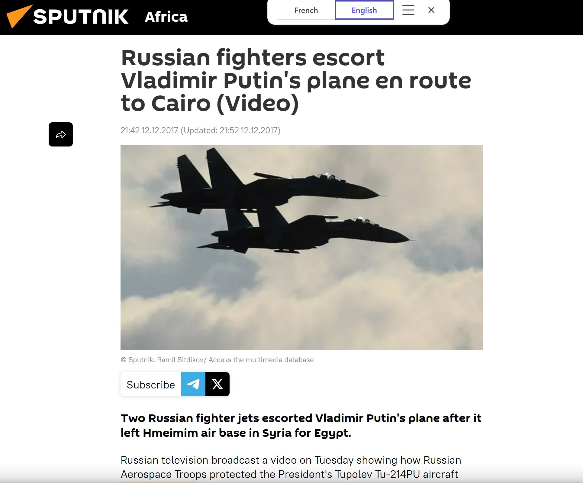 इससे जुड़ी जानकारी सर्च करने पर हमें रूस की सरकारी न्यूज़ एजेंसी स्पुट्निक के वेबसाइट पर फ्रेंच भाषा में 12 दिसंबर 2017 को पब्लिश्ड एक आर्टिकल मिला. इस रिपोर्ट के मुताबिक, सीरिया में ह्मेइमिम एयर बेस से मिस्र के लिए उड़ान भरने के बाद दो रूसी फाइटर जेट्स ने व्लादिमीर पुतिन के प्लेन को एस्कॉर्ट किया था. साथ ही ये भी बताया गया है कि रूसी टेलीविज़न ने मंगलवार को ये वीडियो दिखाया जिसमें रूसी एयरोस्पेस ट्रूप्स ने ह्मेइमिम एयर बेस के अपने अचानक दौरे के बाद सीरियाई एयरस्पेस में राष्ट्रपति व्लादिमीर पुतिन के टुपोलेव Tu-214PU एयरक्राफ्ट की सुरक्षा की. वीडियो में पुतिन अपने प्लेन की बाईं ओर की खिड़की से बाहर देखते हुए दिख रहे हैं, दो फाइटर जेट्स, जो शायद सुखोई Su-27s हैं, वे Tu-214 प्रेसिडेंशियल प्लेन को एस्कॉर्ट कर रहे हैं.