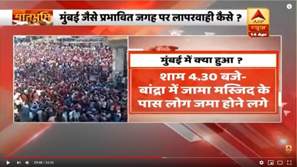 रिपोर्टर इस सवाल को टालते हुए कहता है, “पुलिस इस चीज की जांच करेगी. लेकिन फिलहाल पुलिस ने लोगों को यहां से हटा दिया है.” हालांकि, दुबे ने ये भी कहा कि ये भरोसा करना मुश्किल है कि इतनी बड़ी भीड़ एक स्थान पर बिना किसी प्लानिंग के जमा हुई होगी. प्रसारण के दौरान चैनल ने बार-बार इस बात पर जोर दिया कि भीड़ ‘मस्जिद’ के पास इकट्ठी हुई थी.