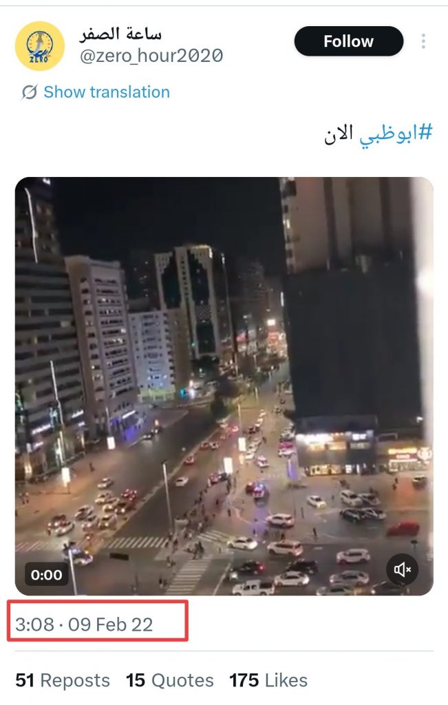 वायरल क्लिप के कीफ्रेम पर रिवर्स इमेज सर्च से हमें चार साल पहले के कई पोस्ट मिले, जिससे पता चलता है कि फ़ुटेज मौजूदा संघर्ष से पहले का है. हमें मिले सबसे शुरुआती उदाहरणों में से एक को जीरो आवर (@zero_hour2020) नामक एक X अकाउंट द्वारा 9 फ़रवरी, 2022 को “अबू धाबी अब” कैप्शन के साथ शेयर किया गया था.