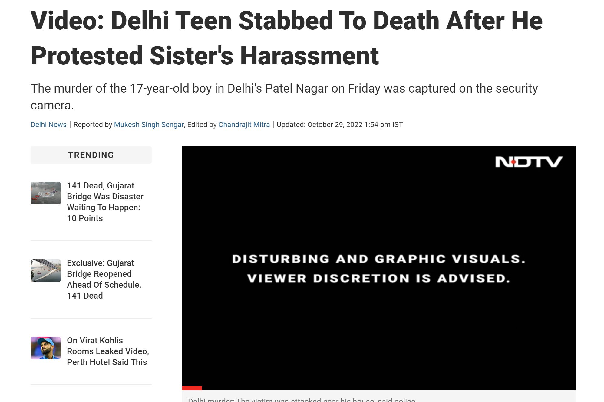 गूगल पर की-वर्ड्स सर्च करने पर हमें NDTV का एक आर्टिकल मिला. इसकी हेडलाइन थी, “अपनी बहन से छेड़छाड़ का विरोध करने पर दिल्ली के किशोर को चाकू मारकर मौत के घाट उतार दिया गया”. इस आर्टिकल में वायरल CCTV फ़ुटेज भी है. आर्टिकल के मुताबिक, कथित तौर पर बहन के साथ छेड़छाड़ का विरोध करने की वज़ह से दिल्ली में दो नाबालिगों ने एक किशोर की चाकू मारकर हत्या कर दी. पुलिस ने कहा कि पीड़ित पर उसके घर के पास हमला किया गया जब वो कंप्यूटर क्लास से लौट रहा था. उसे अस्पताल ले जाया गया. लेकिन तब तक उसकी मौत हो गई थी. मामला दर्ज कर लिया गया है और दोनों नाबालिगों को हिरासत में ले लिया गया है. रिडर्स ध्यान दें कि NDTV के आर्टिकल में आरोपियों के मुस्लिम होने का कोई ज़िक्र नहीं है.
