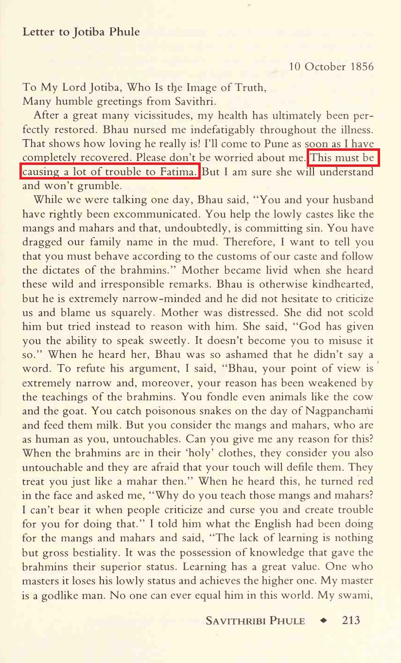 “जिस तरह सावित्रीबाई ने सामाजिक क्षेत्र में महात्मा फुले के काम में योगदान दिया, उसी तरह सगुणाबाई क्षीरसागर, विष्णुपंत थाटे, वामनराव खरातकर और फ़ातिमा शेख जैसे प्रगतिशील विचारकों के योगदान ने भी भूमिका निभाई. सावित्रीबाई फुले दंपत्ति द्वारा खोले गए सामान्य स्कूल में पढ़ाई करने वाली फ़ातिमा शेख उस स्कूल की पहली छात्रा और पहली भारतीय मुस्लिम महिला शिक्षिका बनीं. सावित्रीबाई और फ़ातिमा शेख निचले अछूत समाज की लड़कियों के लिए स्कूलों में पढ़ाती थीं, जबकि अन्य सहायक शिक्षिकाएं ब्राह्मण या धनी लड़कियों के लिए स्कूलों में पढ़ाती थीं. सावित्रीबाई और फ़ातिमा दोनों ही पढ़ाने में पूरी तरह सक्षम थीं.”