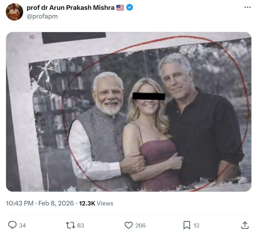 अरुण प्रकाश मिश्रा नाम के एक यूजर ने पीएम मोदी की तस्वीर शेयर करते हुए दावा किया कि उनका नाम एपस्टीन फाइल्स में है और वह एपस्टीन के साथ नज़र आ रहे हैं. (आर्काइव लिंक)