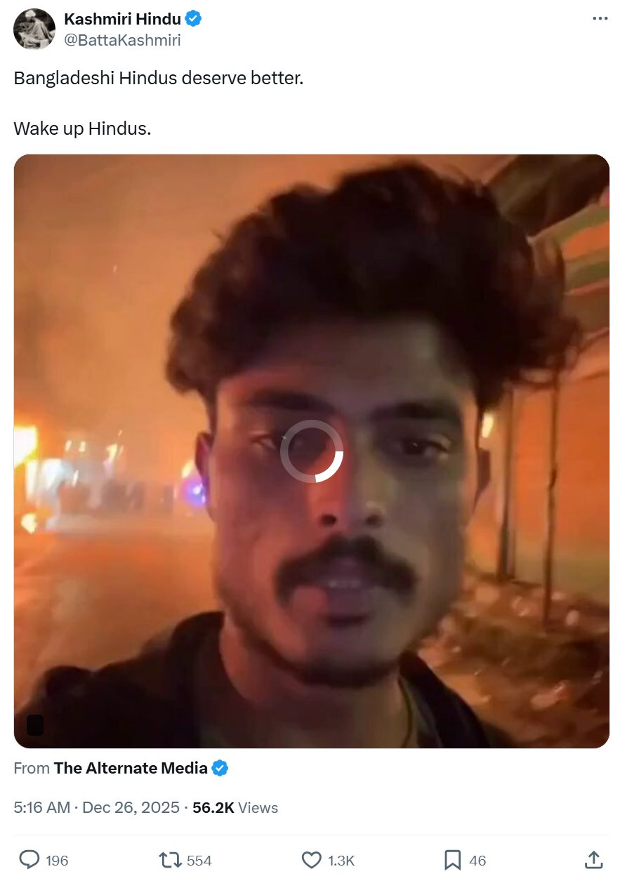 अक्सर गलत जानकारी सांप्रदायिक एंगल के साथ फैलाते हुए पाए जाने वाले अकाउंट @BattaKashmiri ने वीडियो शेयर करते हुए लिखा कि बांग्लादेशी हिंदुओं बेहतर डिज़र्व करते हैं, जागो हिंदुओं. (आर्काइव लिंक)