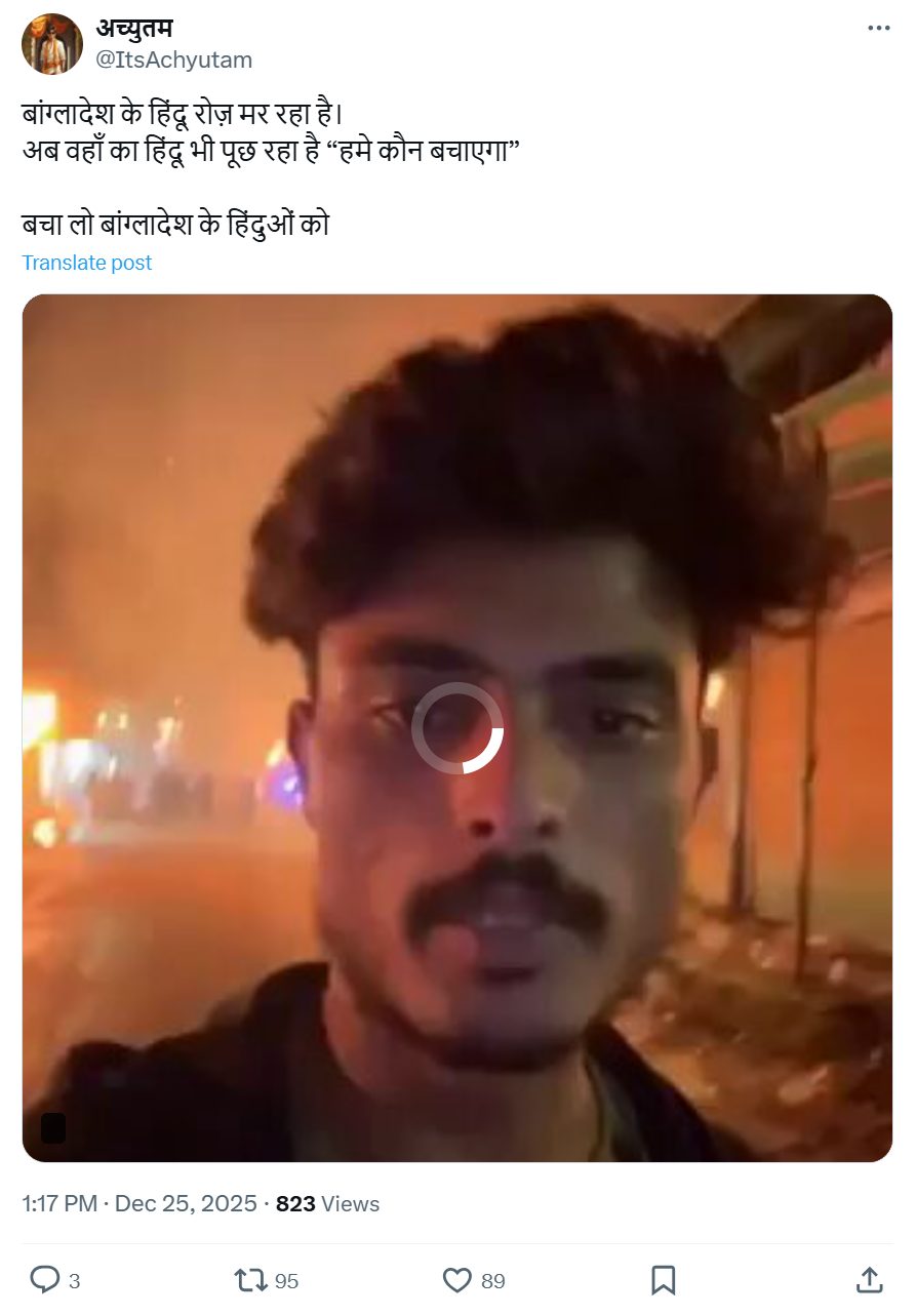 एक वीडियो सोशल मीडिया पर वायरल है जिसमें एक लड़का ब्लॉगिंग करते दिखाई दे रहा है जिसके बैकग्राउंड में दुकानों में आग लगी है. वीडियो में लड़का बोलता है, “ये बांग्लादेश है, अभी रात का वक्त है, दीपू ‘चादर’ जैसे हमें भी खत्म कर देंगे, आप खुद देख सकते हो क्या हो रहा है, इस वीडियो को ज्यादा से ज्यादा शेयर करना ताकि कोई हमें बचा सके. समझ नहीं आ रहा, सबकुछ अचानक बिगड़ गया.”