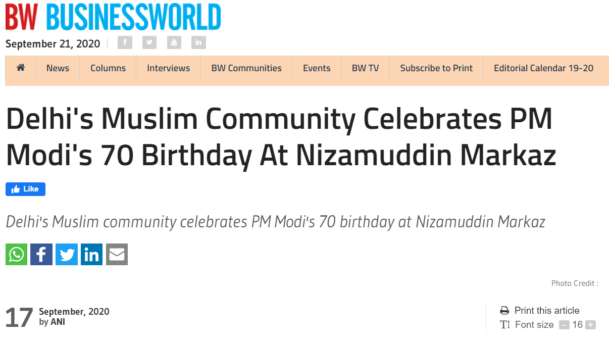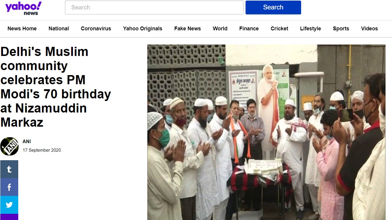 प्रधानमंत्री नरेंद्र मोदी ने 17 सितम्बर, 2020 को अपना 70वां जन्मदिन मनाया. न्यूज़ एजेंसी ANI ने ठीक उसी दिन एक स्टोरी पब्लिश करते हुए दावा किया कि दिल्ली के निज़ामुद्दीन में मुस्लिम समुदाय के लोग इस मौके पर इकठ्ठा हुए और उन्होंने प्रार्थना की और केक काटा. इस रिपोर्ट में एक मौलाना सुहैब कासमी के बयान थे, “प्रधानमंत्री ने पिछले 6 सालों में कभी भी धर्म, जात या वर्ण की कोई बात नहीं की है. उन्होंने बस हमारे देश के130 करोड़ लोगों के बारे में बोला है.”