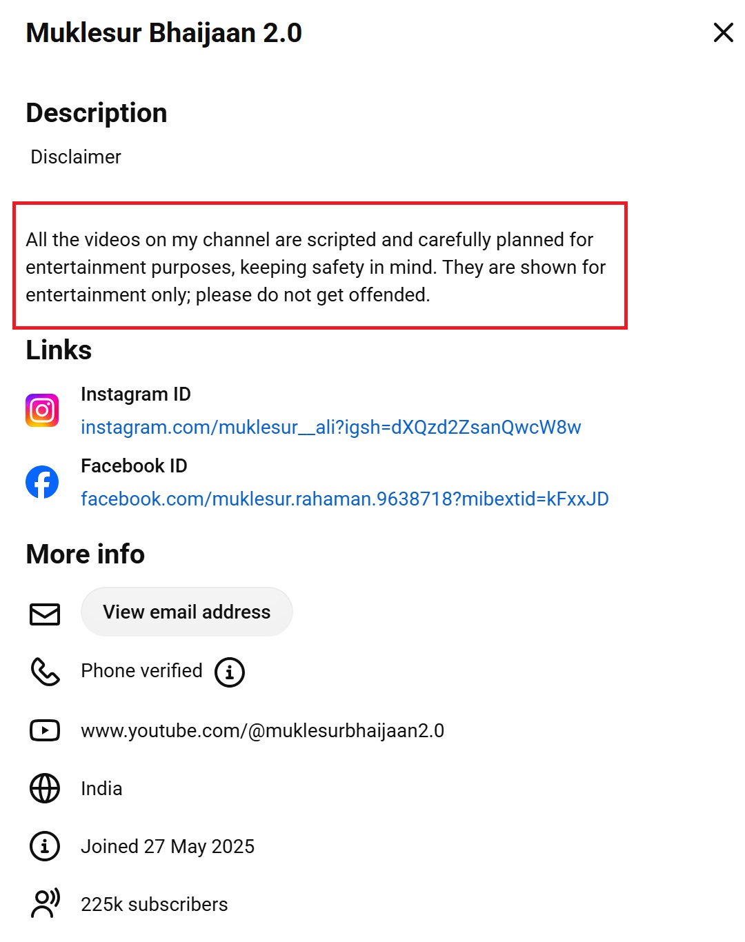 मुकलेसुर अली के फेसबुक प्रोफाइल पर उसके यूट्यूब चैनल का लिंक भी मौजूद है, जहाँ इसी तरह के कई अन्य वीडियोज़ अपलोड किए गए हैं. यूट्यूब चैनल के ‘डिसक्रिप्शन’ सेक्शन में स्पष्ट रूप से एक डिस्क्लेमर दिया गया है जिसमें लिखा है कि इस चैनल पर मौजूद सभी वीडियो स्क्रिप्टेड हैं और मनोरंजन के उद्देश्य से सावधानीपूर्वक योजना बनाकर बनाए गए हैं. चैनल के मालिक ने यह भी साफ किया है कि इन वीडियो का वास्तविकता से कोई संबंध नहीं है और इन्हें केवल दर्शकों के मनोरंजन और सुरक्षा को ध्यान में रखकर तैयार किया गया है.