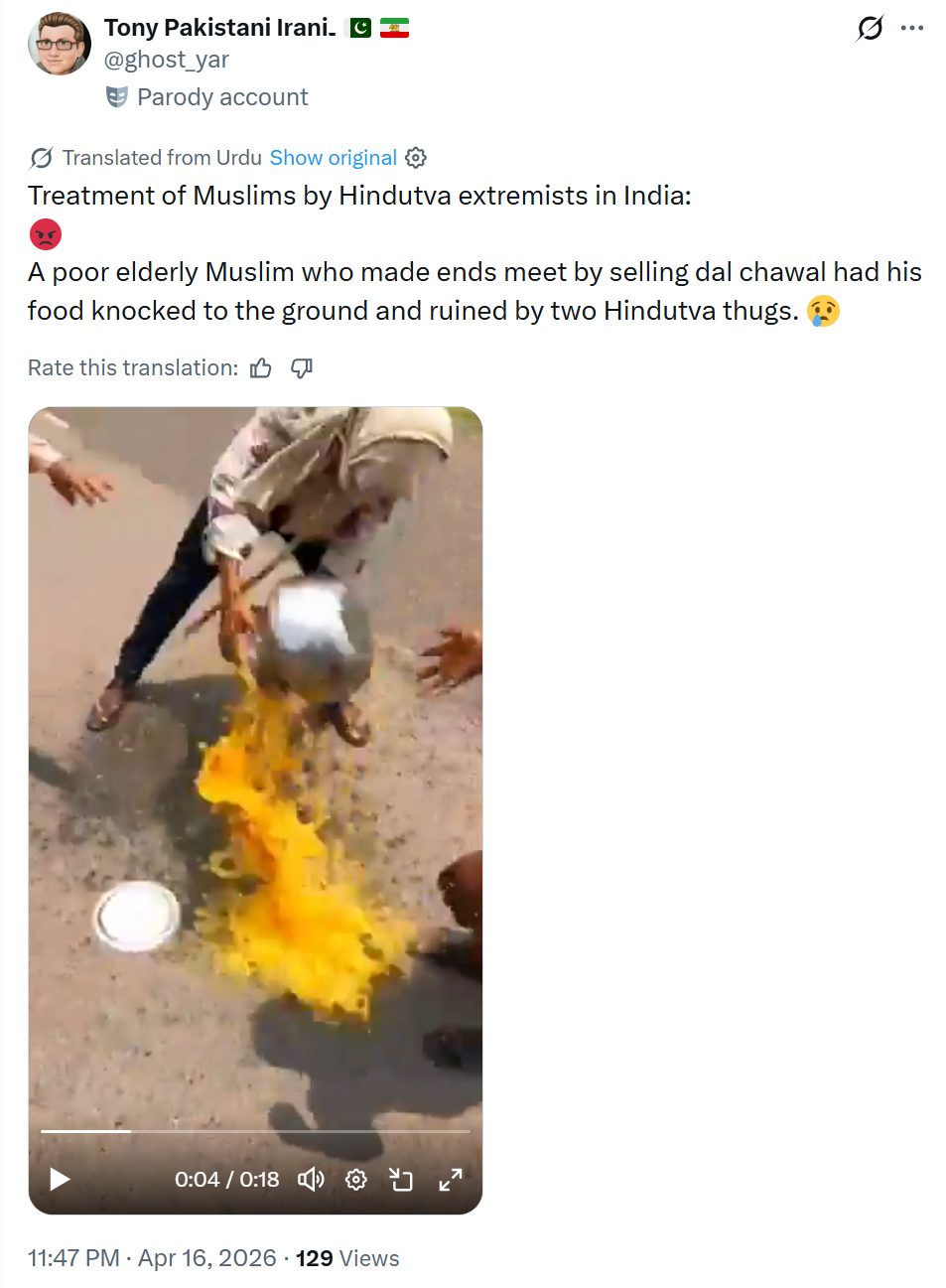 Tony Pakistani Irani नाम के एक यूजर ने वीडियो शेयर करते हुए लिखा, “एक गरीब बुजुर्ग मुस्लिम, जो दाल चावल बेचकर अपना गुजारा करता था, दो हिंदुत्ववादी ठगों ने उसका खाना ज़मीन पर गिरा दिया और बर्बाद कर दिया. भारत में हिंदुत्व चरमपंथियों द्वारा मुसलमानों के साथ यही व्यवहार किया जाता है.” (आर्काइव लिंक)