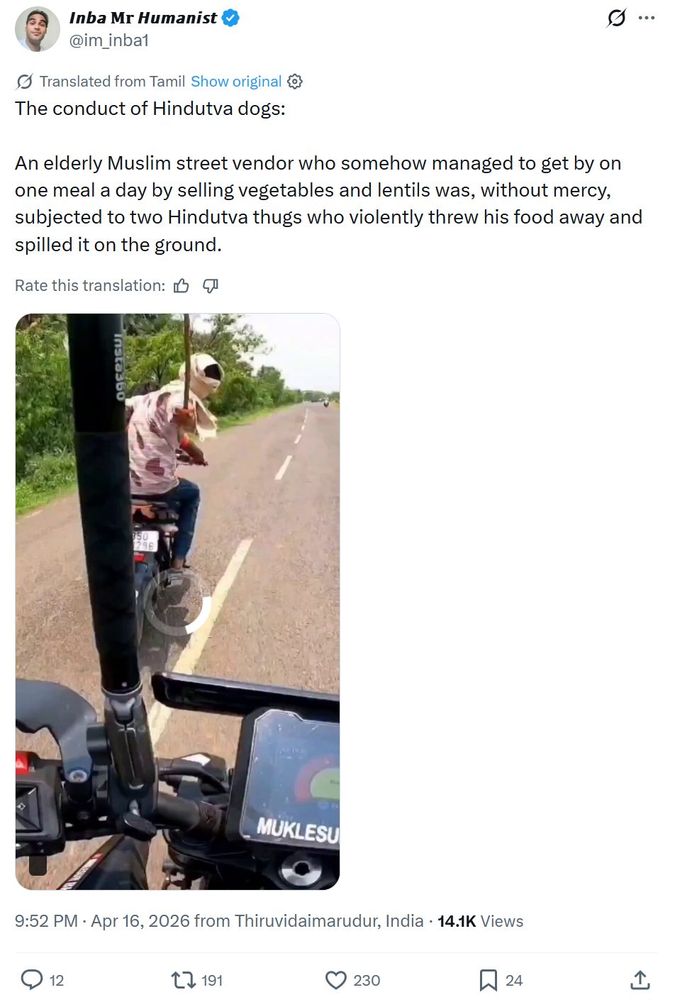 Inba Mr Humanist नाम के एक यूज़र ने ये वीडियो पोस्ट करते हुए लिखा कि एक बुजुर्ग मुस्लिम रेहड़ी-पटरी विक्रेता किसी तरह सब्जी और दाल बेचकर एक समय का भोजन जुटा पाता था, दो हिंदुत्ववादी ठगों ने बिना किसी दया के उसका खाना फेंक दिया और उसे ज़मीन पर गिरा दिया. (आर्काइव लिंक)