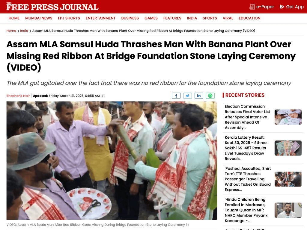 प्रेस फ्री जर्नल और द गुवाहाटी न्यूज़ ने भी इस बारे में न्यूज़ रिपोर्ट्स पब्लिश की थी. इन खबरों के अनुसार, असम की स्थानीय पार्टी ऑल इंडिया यूनाइटेड डेमोक्रेटिक फ्रंट (AIUDF) के पूर्वी बिलासीपारा विधानसभा क्षेत्र के विधायक सम्सुल हुदा को शिलान्यास समारोह का रिबन काटने के लिए आमंत्रित किया गया था, इसी बीच 18 मार्च 2025 को शिलान्यास समारोह में छोटे केले के पौधे और लाल रिबन की जगह गुलाबी रिबन बंधा देखकर विधायक भड़क गए और पुल ठेकेदार के सहकर्मी साहिदुर रहमान की पिटाई कर दी.