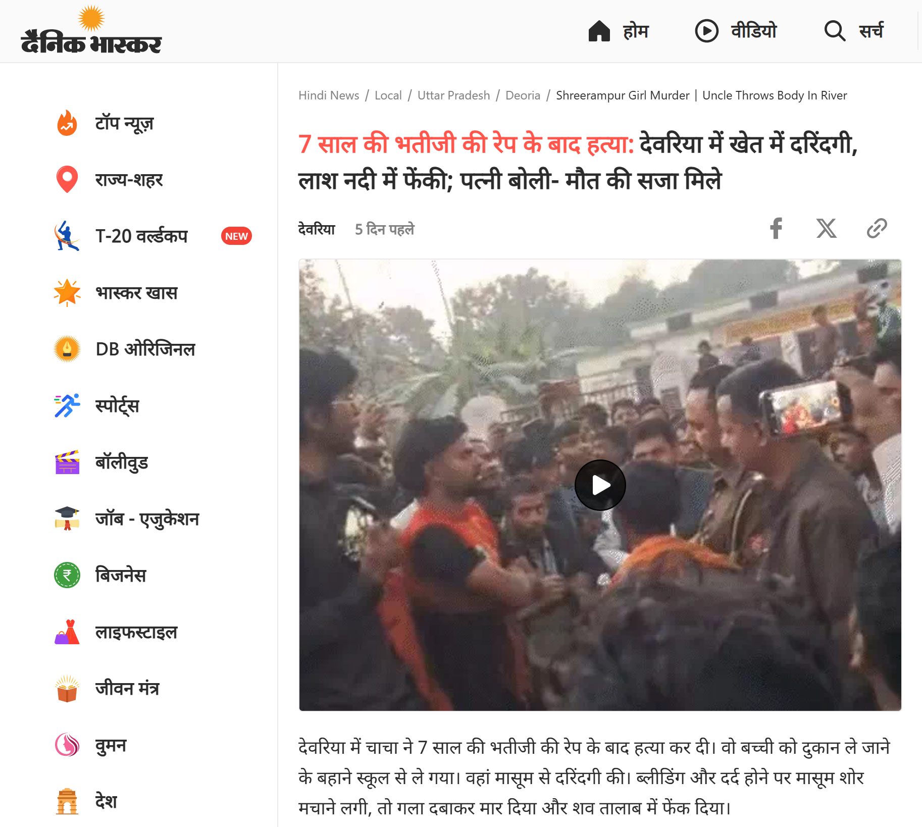 इस घटना से जुड़े की-वर्ड्स सर्च करने पर हमें दैनिक भास्कर की वेबसाइट पर 11 फरवरी को प्रकाशित खबर मिली. इस रिपोर्ट के मुताबिक, देवरिया में 11 फरवरी को 7 साल की बच्ची के साथ उसके चाचा ने रेप किया और बाद में उसकी हत्या कर दी. आरोपी ने बच्ची को दुकान ले जाने के बहाने स्कूल से बुलाया और उसे खेत ले जा कर दरिंदगी की. दर्द से बच्ची चिल्लाने लगी तो आरोपी चाचा ने उसका गला दबाकर उसकी हत्या कर दी और उसका शव झरही नदी में फेंक दिया. रिपोर्ट में आरोपी को 35 वर्षीय विद्यासागर बताया गया है.