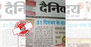 समाचार पत्र दर्शाती एक तस्वीर व्हाट्सएप्प पर व्यापक रूप से प्रसारित है। लेख के शीर्षक के अनुसार, ’31 दिसंबर के बाद बदले नहीं जा सकेंगे 2000 रूपये के नोट!’ लेख…