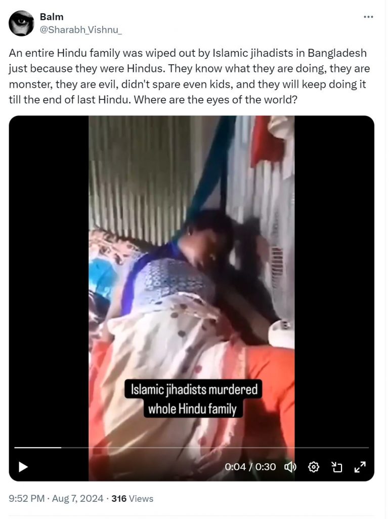 एक्स यूज़र @Sharbh_Vishnu_ ने भी वायरल क्लिप पोस्ट की, साथ ही दावा किया कि हिंदू परिवार की इस्लामी चरमपंथियों द्वारा हत्या कर दी गई. (आर्काइव)