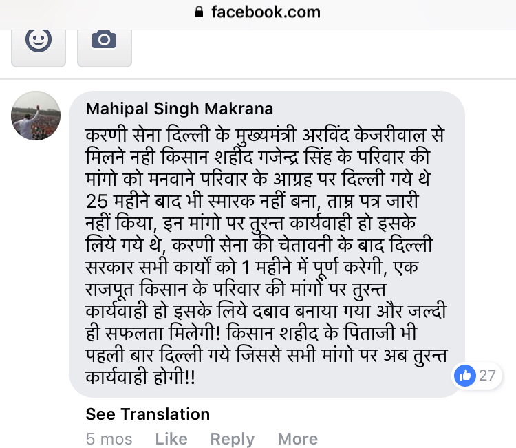 एक कमेंट में वे यह भी कहते है की दिल्ली जाने का मकसद अरविन्द केजरीवाल से मिलना नहीं था। बल्कि वे इस मुद्दे को उठाने के लिए गए थे की गजेंद्र सिंह की मौत के बाद किये गए वादों को नहीं निभाया गया। इस कमेंट में ये भी बताते है की कर्णी सेना की चेतावनी के बाद दिल्ली सरकार ने एक महीने में सारे लंबित मुद्दों पर अमल करने का वादा किया है।