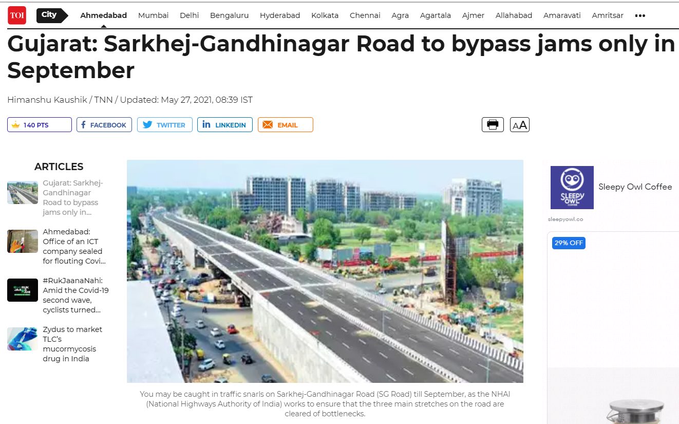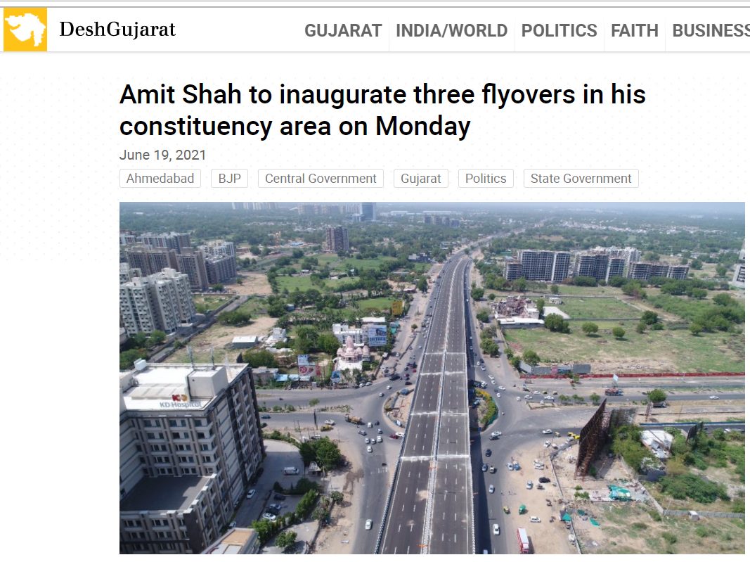 सबसे पहले बात करते हैं अहमदाबाद के वैष्णोदेवी फ़्लाईओवर की. अहमदाबाद में वैष्णोदेवी सर्कल पर बने फ़्लाईओवर का उदघाटन गृह मंत्री अमित शाह ने 21 जून 2021 को किया था. द टाइम्स ऑफ इंडिया ने रिपोर्ट मेंवैष्णोदेवी फ़्लाईओवर की तस्वीर भी शेयर की है. इसे देखने से साफ़ मालूम हो जाता है कि वायरल हो रही तस्वीर वैष्णोदेवी फ़्लाईओवर की नहीं है. देश गुजरात ने भी वैष्णोदेवी फ़्लाईओवर की तस्वीर शेयर की है जोशेयर की गई तस्वीर से बिलकुल अलग है.
