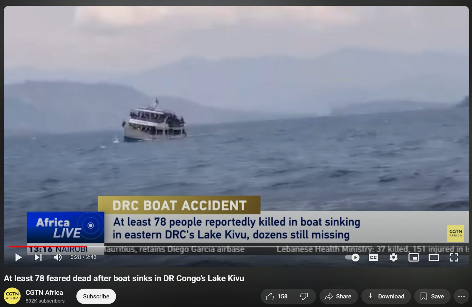 4 अक्टूबर, 2024 को पब्लिश इस रिपोर्ट के मुताबिक, मध्य अफ्रीका में डेमोक्रेटिक रिपब्लिक ऑफ़ कांगो (DRC) में किवु झील में एक नाव डूबने से कम से कम 78 लोगों की मौत हो गई.
