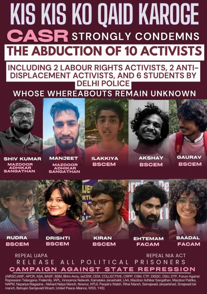 ‘कैंपेन अगेंस्ट स्टेट रिप्रेशन (CSAR)’ संगठन ने 13 मार्च को एक बयान जारी किया. उन्होंने आरोप लगाया कि दिल्ली पुलिस द्वारा 10 कार्यकर्ताओं का अपहरण कर लिया गया है. इनमें 2 श्रम अधिकार कार्यकर्ता (शिव कुमार, मनजीत), 2 विस्थापन विरोधी कार्यकर्ता (बादल, एहतमाम) और 6 छात्र (इलाक्किया, गौरव, अक्षय, रुद्र, दृष्टि, अविनाश) शामिल हैं.