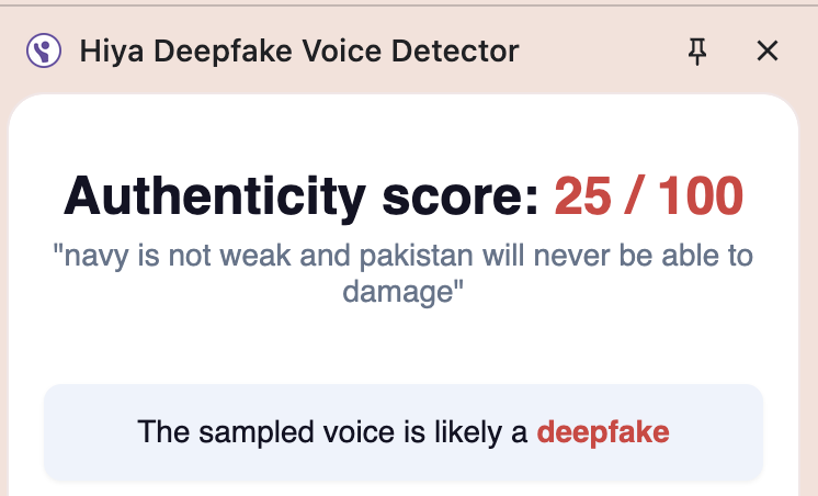 वायरल वीडियो के ऑडियो को ध्यान से सुनने पर हमने पाया कि जनरल अनिल चौहान की आवाज़ मूल वीडियो से अलग है. साथ ही वायरल वीडियो में जनरल अनिल चौहान के लिपसिंक भी कई जगहों पर मेल नहीं हो रहे हैं. हमने AI डिडेक्टर टूल की मदद से वीडियो के ऑडियो की जाँच की. यहां ऑडियो के डीपफ़ेक होने की संभावना बताई गई.