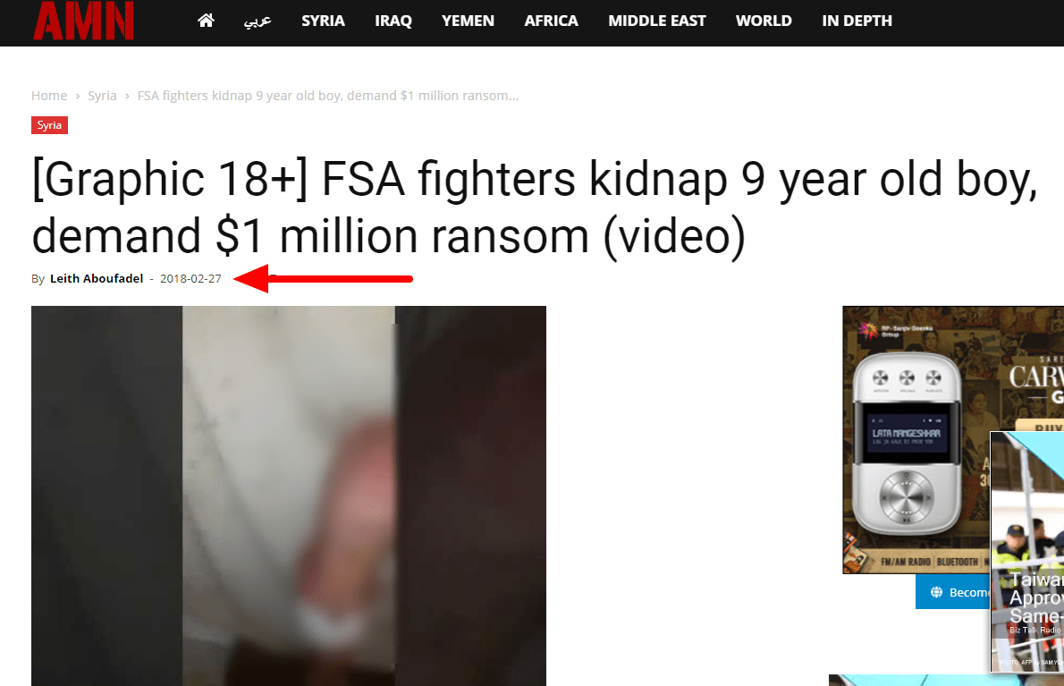 इसके अलावा जब ऑल्ट न्यूज़ ने इसकी पुष्टि करने के लिए वीडियो के की-फ्रेम को रिवर्स इमेज सर्च इंजन यान्डेक्स पर सर्च किया तब इस वीडियो से जुड़े हुए कई रिपोर्ट हमें मिले। एक मध्य-पूर्वीय ऑनलाइन मीडिया संगठन अल-मसदार द्वारा इस घटना क्रम के बारे में फ़रवरी 2018 में एक लेख प्रकाशित किया गया था। उस लेख के मुताबिक, “फ्री सीरिया आर्मी (FSA) के कुछ लड़ाकू साथियों द्वारा 9 वर्षीय एक बच्चे को अगवा कर लिया, जब वह पूर्वीय इलाके में स्थित अपने स्कूल जा रहा था। (जनवरी,2018), 9 साल के बच्चे को अगाव करने के बाद से ही फ्री सीरिया आर्मी के लोग बच्चे के परिवार से उसकी रिहाई के लिए 10 लाख डॉलर की मांग कर रहे हैं।”-(अनुवाद )