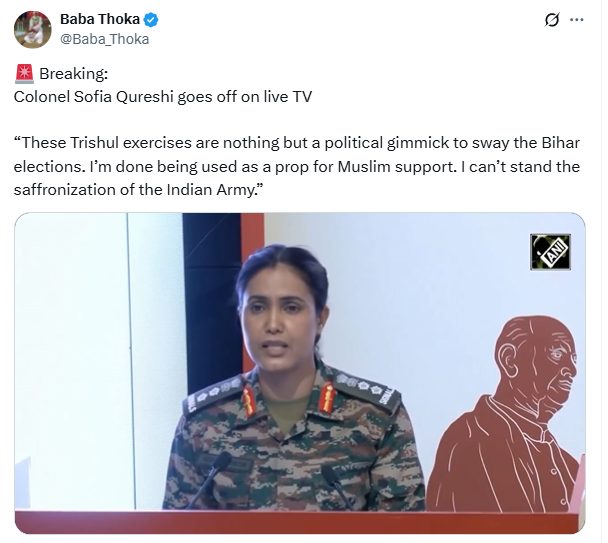 कर्नल सोफ़िया क़ुरैशी का एक वीडियो हाल में खूब शेयर किया जा रहा है. वीडियो में वो भारतीय सेना में “भगवाकरण” के बारे में कथित रूप से बात कर रही है और कह रही है कि उनका काम देश की रक्षा करना है, भाजपा या RSS के लिए एक वैचारिक पोत बनना नहीं है. सोशल मीडिया यूज़र्स का कहना है कि कर्नल सोफ़िया क़ुरैशी ने लाइव टेलीविज़न पर “राजनीतिक बम” गिराया है.