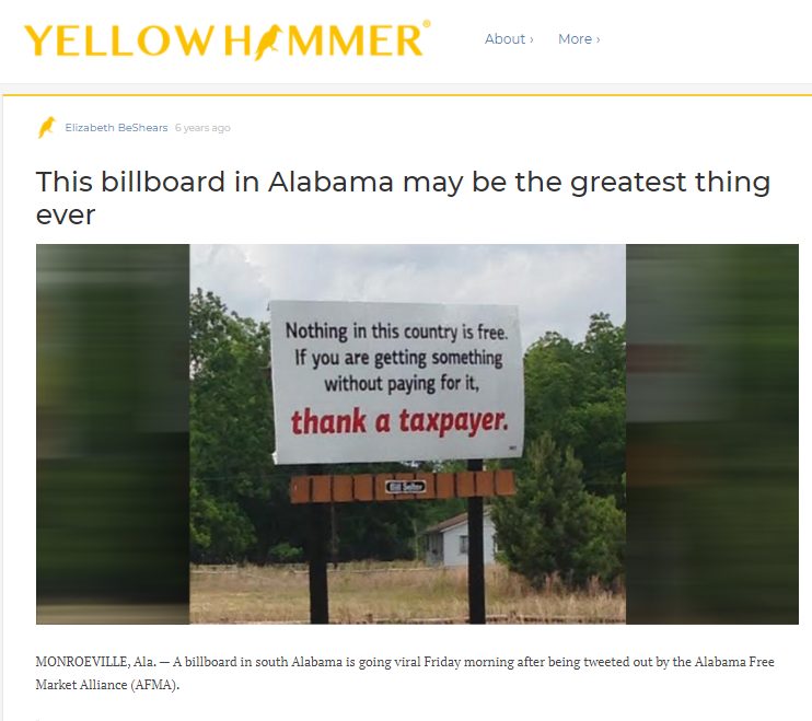 आर्टिकल के मुताबिक, ये बिलबोर्ड की तस्वीर एलबेमा फ़्री मार्केट अलायन्स (AFMA) ने 5 जून 2015 को ट्वीट की थी.