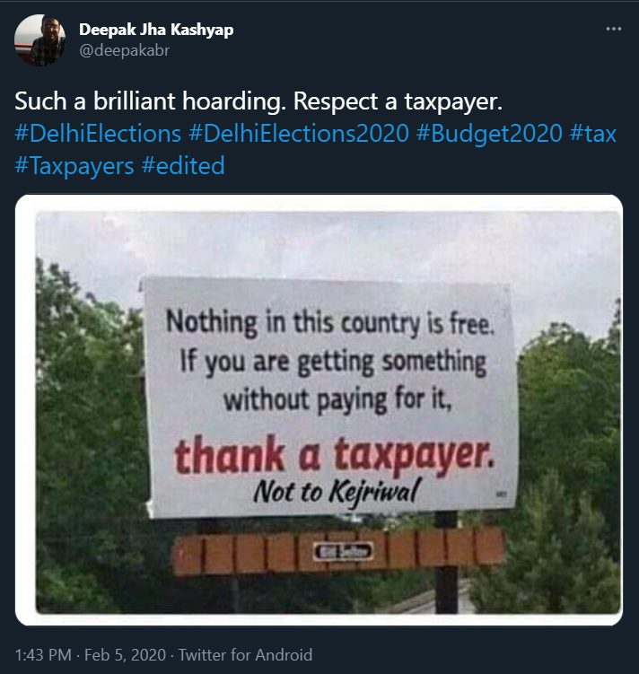 सोशल मीडिया पर एक होर्डिंग की तस्वीर खूब वायरल है. होर्डिंग पर लिखा है – “इस देश में कुछ भी मुफ़्त नहीं है. अगर आपको कुछ बिना पैसे दिए मिल रहा है तो टैक्स भरने वालों को शुक्रिया करें केजरीवाल को नहीं.” मेजर सुरेन्द्र पूनिया ने ये तस्वीर 29 जुलाई को ये तस्वीर शेयर करते हुए लिखा, “बिलकुल सच! सभी टैक्स भरने वालों को सेल्यूट”. (आर्काइव लिंक)