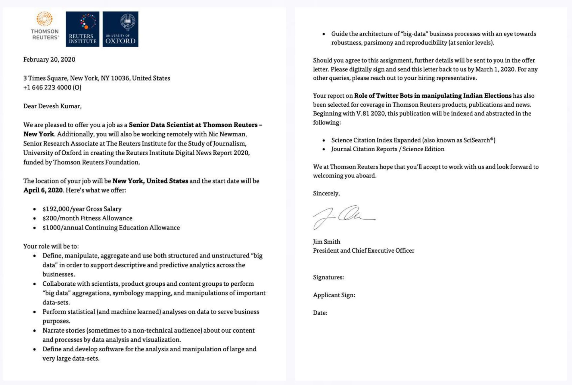 2020 में देवेश ने न्यूयॉर्क के थॉमसन रॉयटर्स का एक ऑफ़र लेटर तैयार किया. इसके मुताबिक, उन्हें सालाना 192,000 USD यानी, करीब 13 लाख रुपये प्रति महीने की सालाना ग्रॉस सैलरी ऑफ़र की गई थी. हमारे सूत्रों ने स्वतंत्र रूप से हमें बताया कि देवेश ने MGIEP के साथ अपने कॉन्ट्रैक्ट के रिन्यूअल के दौरान सैलरी बढ़ाने में सौदेबाजी करने के लिए इस ऑफ़र लेटर का इस्तेमाल किया था. सूत्रों ने जोर देकर कहा कि वेतन बढ़ाने का आधार देवेश की ‘असाधारण प्रतिभा’ थी.