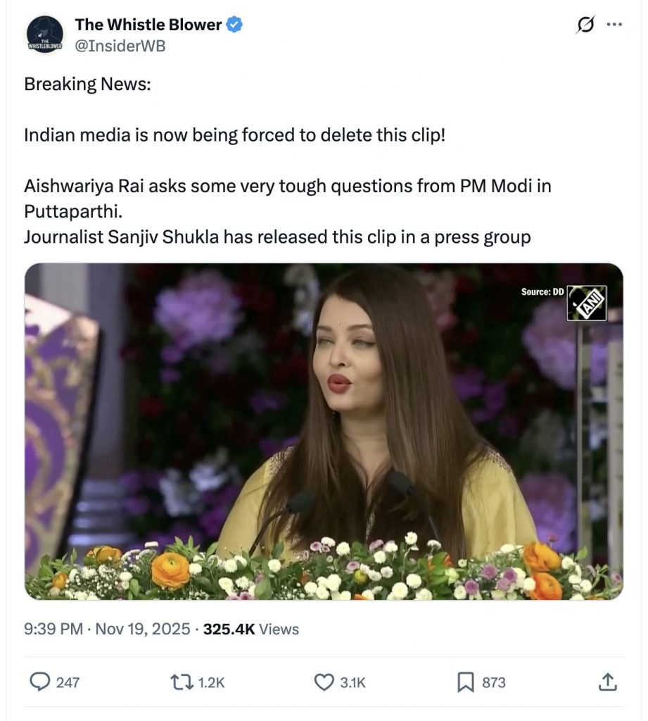 X-हैंडल @Rameshspeech ने ये वीडियो शेयर कर इसे ब्रेकिंग न्यूज़ बताया. यूज़र ने लिखा, “भारतीय मीडिया अब इस क्लिप को डिलीट करने पर मजबूर हो रहा है, ऐश्वर्या राय ने पुट्टपर्थी में पीएम मोदी से कुछ बेहद तीखे सवाल पूछे हैं. पत्रकार संजीव शुक्ला ने यह क्लिप एक प्रेस ग्रुप में जारी की है.”