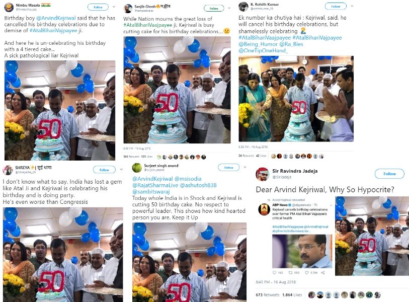 पूर्व प्रधानमंत्री अटल बिहारी वाजपेयी की मौत के तुरंत बाद फेसबुक पेज ‘योगी आदित्यनाथ-ट्रू इंडियन’ पर दिल्ली के मुख्यमंत्री केजरीवाल का केक काटते फोटो 16 अगस्त को 8.30 बजे पोस्ट किया गया जिसे 14,000 लोगों में शेयर किया। जिसमें लिखा है कि अटल बिहारी जी की मौत के ठीक बाद केजरीवाल ने अपना जन्मदिन मनाया। इस पर मुख्यमंत्री की असंवेदनशीलता की निदां करते हुए कई यूजर्स ने कमेंट (टिप्पणियां) किए हैं।
