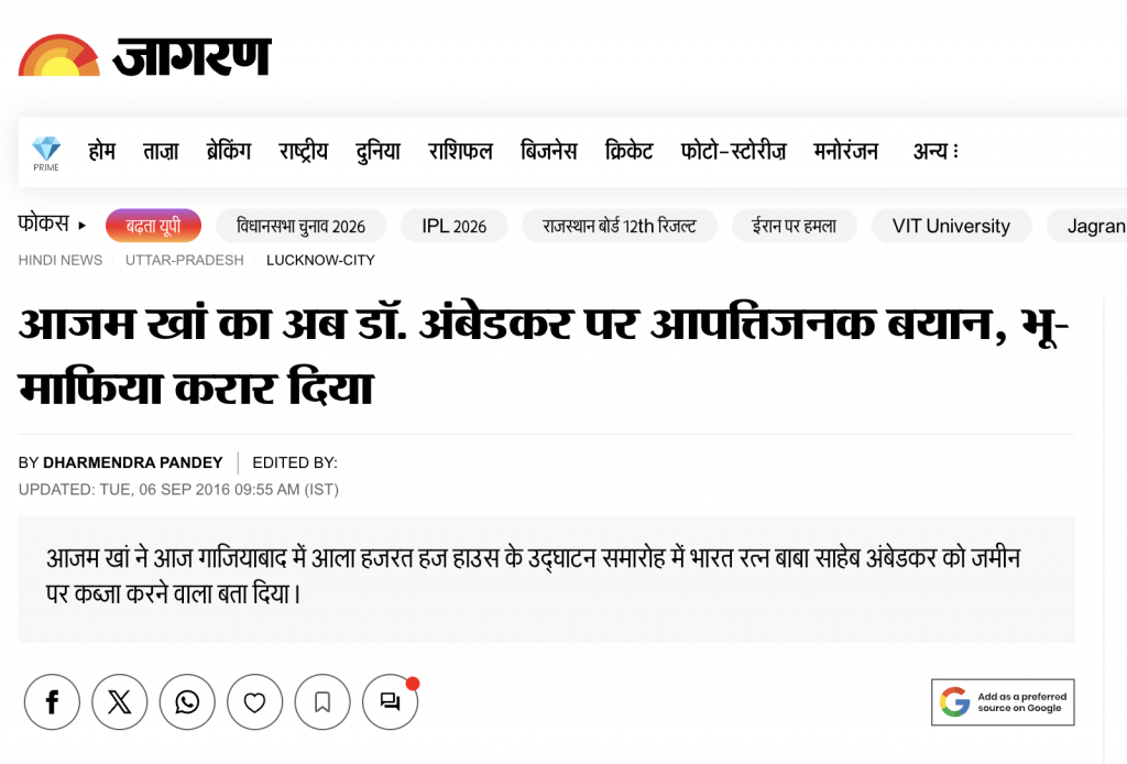 जागरण की एक रिपोर्ट अनुसार, 2016 में तात्कालिक उत्तर प्रदेश सरकार के कैबिनेट मंत्री आज़म ख़ान ने गाजियाबाद में आला हजरत हज हाउस के उद्घाटन समारोह के दौरान मंच पर अखिलेश यादव के मौजूदगी में ही बाबा साहेब अम्बेडकर पर आपत्तिजनक बयान दिया था. आज़म ख़ान ने पिछली सरकार बहुजन समाजवादी पार्टी (बसपा) और मायावती पर निशाना बनाते हुए कहा था उत्तर प्रदेश में सैकड़ों जगह पर एक साहब की प्रतिमा लगी है, उसमें उनकी उंगली कुछ खास इशारा करती है.