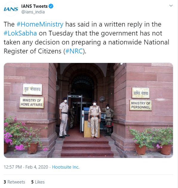 IANS के एक ट्वीट के अनुसार, “The #HomeMinistry has said in a written reply in the #LokSabha on Tuesday that the government has not taken any decision on preparing a nationwide National Register of Citizens (NRC). (अनुवाद – गृह मंत्रालय ने मंगलवार को लोकसभा में एक लिखित जवाब में कहा है कि सरकार ने राष्ट्रव्यापी नागरिकता रजिस्टर (NRC) तैयार करने पर कोई निर्णय नहीं लिया है।)”