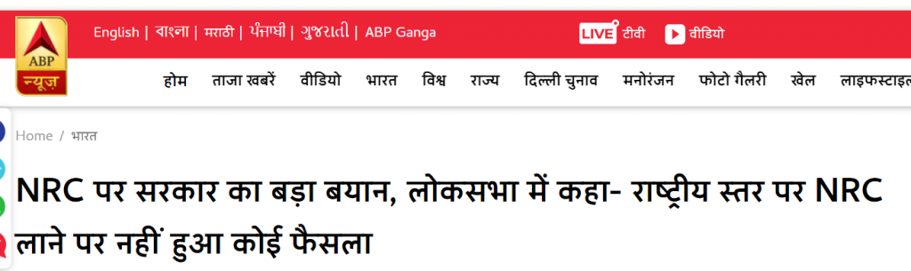 ABP न्यूज़ के एक लेख का शीर्षक है, “NRC पर सरकार का बड़ा बयान, लोकसभा में कहा- राष्ट्रीय स्तर पर NRC लाने पर नहीं हुआ कोई फैसला”