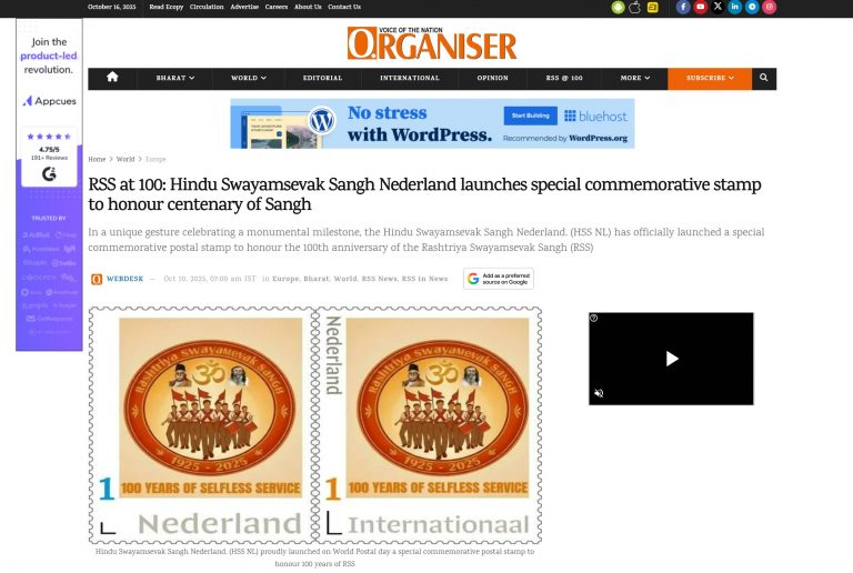 रिपोर्ट में कहा गया है, “इस महत्वपूर्ण मील के पत्थर का सम्मान करने के लिए हिंदू स्वयंसेवक संघ नीदरलैंड (HSS NL) ने विश्व डाक दिवस पर गर्व से एक विशेष स्मारक डाक टिकट लॉन्च किया – जो विश्व के सार्वभौमिक धर्म के प्रति सौ साल की एकता, अनुशासन और भक्ति का प्रतीक है.” (sic)