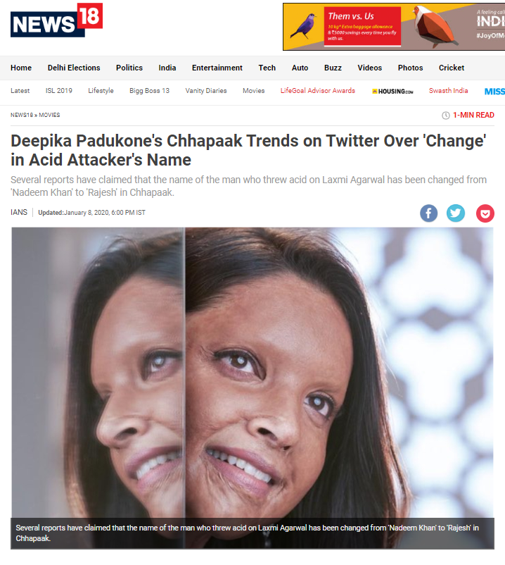 News18 ने 9 जनवरी को अधिवक्ता ईशकरन सिंह भंडारी के ट्वीट के आधार पर इस कहानी में एक नया मोड़ दिया। मीडिया संगठन ने दावा किया “विरोध के बाद दीपिका पादुकोण ने सुधारी ये गलती! रातों-रात ‘छपाक’ में बदलाव का दावा”