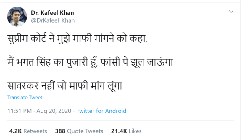 इस हैन्डल ने 1 सितंबर 2020 को सुबह 10 बजकर 47 मिनट ट्वीट किया, “आज मुझे बेल मिल गयी, मेरे लिए दुआ करने के लिए आप सबका तहे-दिल से शुक्रिया”. लेकिन डॉ. कफ़ील खान रात 12 बजे के बाद रिहा हुए थे तो वो सुबह 10 बजे ट्वीट नहीं कर सकते है.