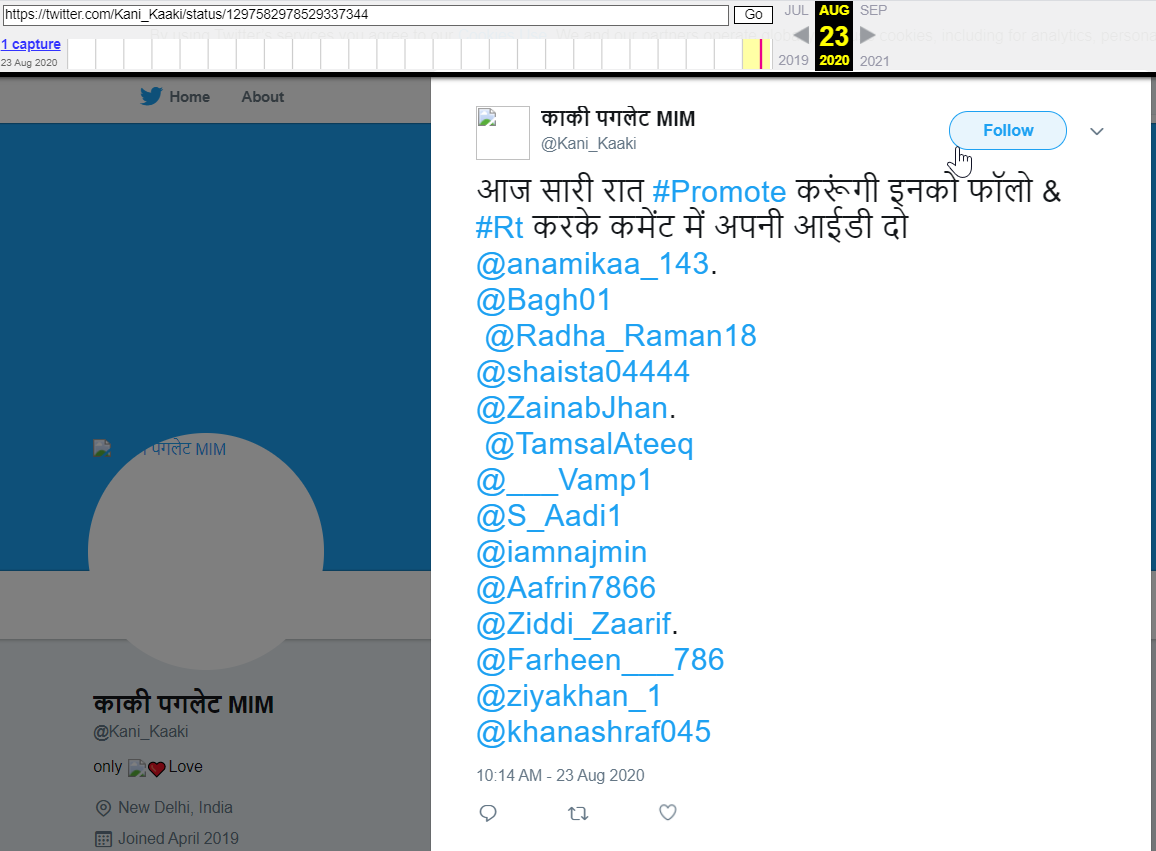 इस हैन्डल के कई पुराने ट्वीट्स पर आये रिप्लाइ में इस हैन्डल का नाम ‘@Kani_Kaaki’ लिखा हुआ है. हैन्डल ‘@Kani_Kaaki’ के एक पुराने ट्वीट का आर्काइव वर्ज़न आप यहां देख सकते हैं. हैन्डल ‘@Kani_Kaaki’ के एक ट्वीट का लिंक आप ओपन करेंगे तो आप हैन्डल ‘@Shabbo_Khan_’ तक पहुंचेंगे. उदाहारण के तौर पर इस हैन्डल के 23 अगस्त 2020 के ट्वीट का ये लिंक आप ओपन करें – https://twitter.com/Kani_Kaaki/status/1297582978529337344. इस लिंक में हैन्डल नेम ‘@Kani_Kaaki’ लिखा हुआ है मगर जब आप इसे खोलेंगे तो आप हैन्डल ‘@Shabbo_Khan_’ के ट्वीट तक पहुंचेंगे.