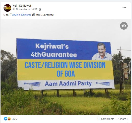 सोशल मीडिया पर आम आदमी पार्टी के बिलबोर्ड की एक तस्वीर वायरल है. इस बोर्ड पर अरविंद केजरीवाल की ओर से गोवा में जाति और धर्म के आधार पर विभाजन करने की बात लिखी है. फ़ेसबुक पेज ‘Kejri Ke Bawal’ ने ये तस्वीर पोस्ट की.