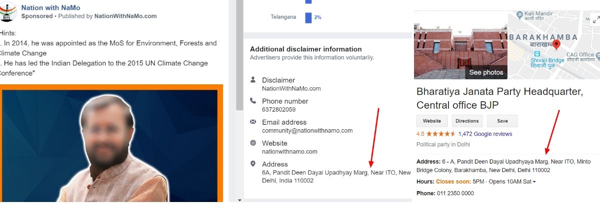 ‘माई फर्स्ट वोट फॉर मोदी’ के विज्ञापन लाइब्रेरी डेटा को देखने पर, ऑल्ट न्यूज़ ने पाया कि इस पेज की अस्वीकरण जानकारी में, दिल्ली में भाजपा मुख्यालय का पता — ‘6-ए, पंडित दीन दयाल उपाध्याय मार्ग, आईटीओ के पास, मिंटो ब्रिज कॉलोनी, बाराखंभा, नई दिल्ली 110002 — प्रदान किया गया है।