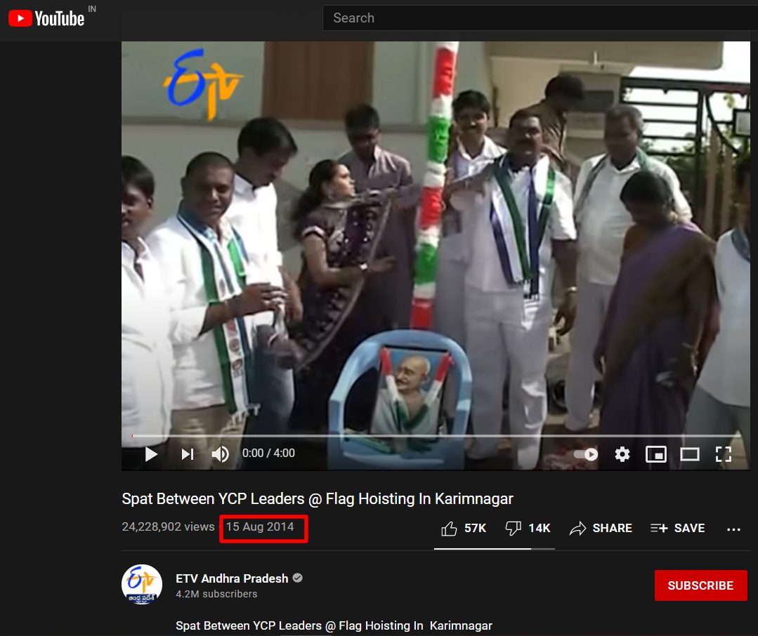 ऑल्ट न्यूज़ ने इस वीडियो की जांच के लिए यूट्यूब पर की-वर्ड्स सर्च किया. 15 अगस्त 2014 की ETV आंध्र प्रदेश की वीडियो रिपोर्ट में इस घटना की खबर शेयर की गई थी. रिपोर्ट के मुताबिक, करीमनगर में ध्वजारोहण कार्यक्रम के दौरान YSR कांग्रेस पार्टी के कार्यकर्ताओं के बीच विवाद हुआ था.