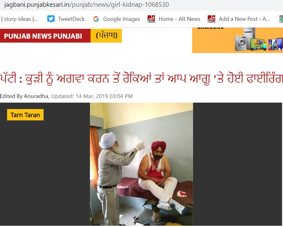 शाहजहांपुर पुलिस के इस ट्वीट से एक बात तो साफ़ हो जाती है कि इन तस्वीरों का उत्तर-प्रदेश के शाहजहांपुर से कोई लेना-देना नहीं हैं. आगे, घायल व्यक्ति की तस्वीर रिवर्स इमेज सर्च करने पर 14 मार्च 2019 की जगवाणी पंजाब केसरी की रिपोर्ट मिली. आर्टिकल के अनुसार, वायरल तस्वीर में दिख रहे व्यक्ति की पहचान आम आदमी पार्टी के पटियाला (ग्रामीण) यूनिट के अध्यक्ष चेतन सिंह के रूप में की गई है. पंजाबी भाषा में पब्लिश हुए इस आर्टिकल में बताया गया कि पट्टी विधानसभा क्षेत्र में एक लड़की को कुछ लोग गाड़ी में ज़बरदस्ती ले जाने की कोशिश कर रहे थे. उस वक़्त वहां पर चेतन सिंह मौजूद थे. इस लड़की को बचाने की कोशिश करते हुए वो घायल हो गए. गाड़ी में सवार बदमाशों में से किसी ने चेतन पर गोलिया चलाईं जिनसे वो घायल हो गए. उन्हें तुरंत ही गांववालों ने सरकारी अस्पताल में भर्ती करवाया. बाद में हालत गंभीर होने के पर चेतन को तरनतारन के एक अस्पताल ले जाया गया.