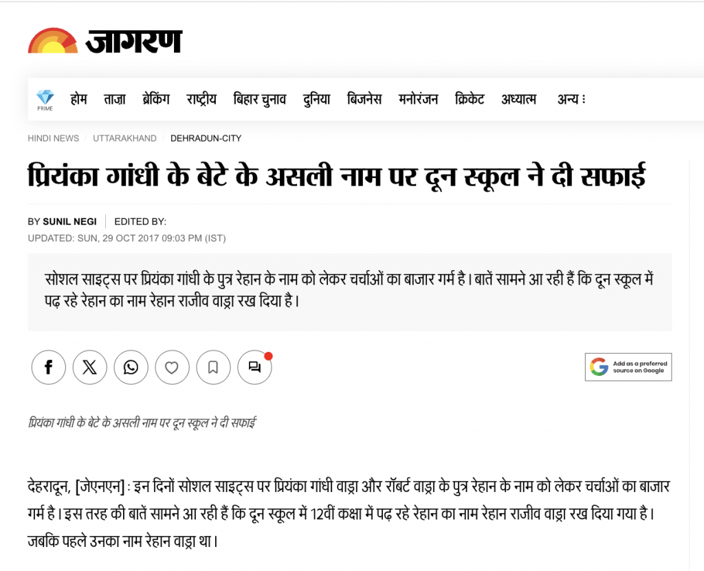 इसके अलावा 29 अक्टूबर 2017 की जागरण न्यूज़ की एक रिपोर्ट में बताया गया है कि रेहान ने सातवीं कक्षा में अंतरराष्ट्रीय ख्याति वाले देहरादून स्थित दून स्कूल में दाखिला लिया. तभी से नाम को लेकर ये भ्रम हो गया था. कुछ जगह रेहान का नाम रेहान राजीव रॉबर्ट वाड्रा व कुछ जगह रेहान राजीव वाड्रा गांधी भी बताया जा रहा था. इन चर्चाओं पर विराम लगाते हुए दून स्कूल के जनसंपर्क अधिकारी (पीआरओ) पीयूष मालवीय ने बताया था कि रेहान का वही नाम कायम है, जो उन्होंने स्कूल में दाखिला लेते वक्त रेहान राजीव वाड्रा नाम दर्ज कराया था.