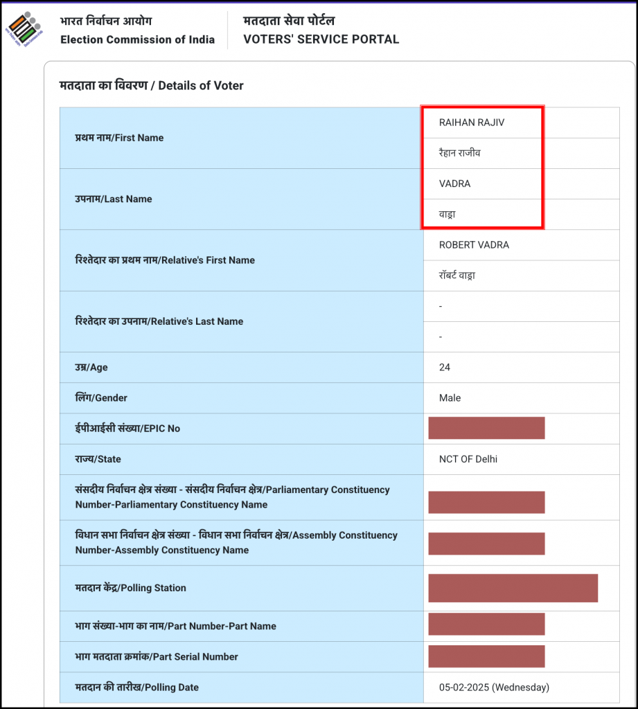 हमने भारत निर्वाचन आयोग के मतदाता सेवा पोर्टल से मतदाता का विवरण सूची में भी प्रियंका गांधी वाड्रा के बेटे की डिटेल्स चेक किये. इसमें रेहान का पूरा नाम रेहान राजीव वाड्रा (Raihan Rajiv Vadra) लिखा हुआ है, ना कि रेहान राजीव गांधी.