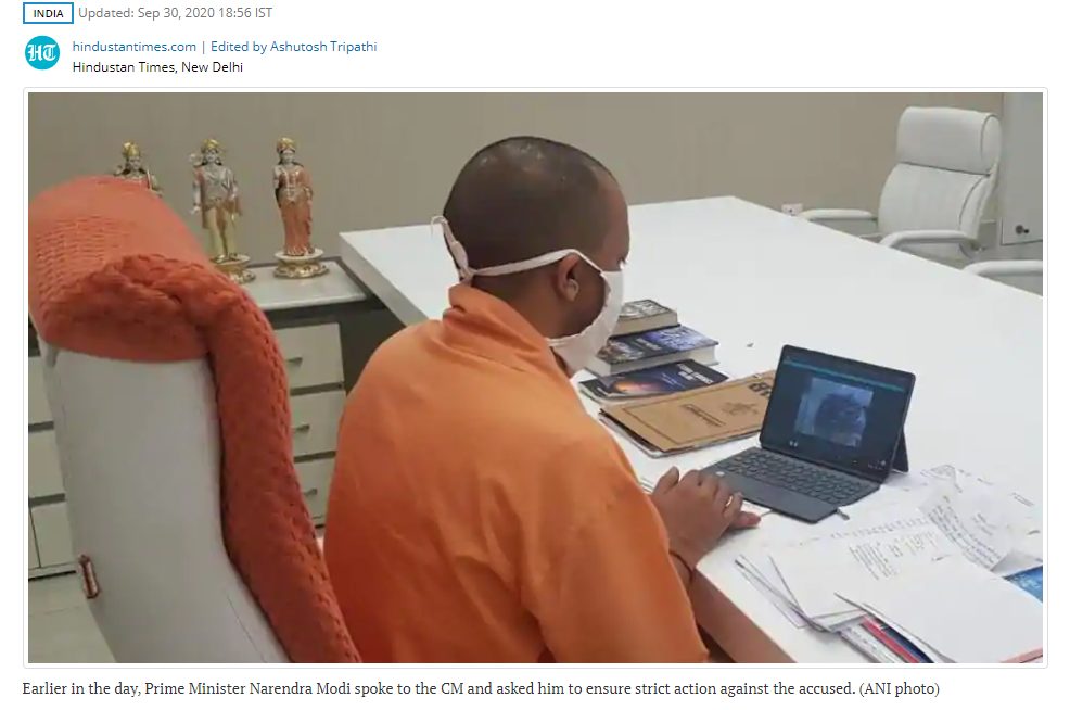 इस मामले में न्यूज़ रिपोर्ट्स और ख़बरों के साथ-साथ कई गलत सूचनाएं सोशल मीडिया पर खूब वायरल हो रही हैं. हाल ही में फ़ेसबुक यूज़र नीरज कुमार धनवाल ने यूपी के मुख्यमंत्री योगी आदित्यनाथ की एक तस्वीर शेयर करते हुए दावा किया कि वो लैपटॉप पर पीड़िता के शव को जलाये जाने का प्रकरण देख रहे हैं. साथ में लिखा, “इसके लिए 2-2 शब्द जरूर बोलो.” इस पोस्ट को 8,400 से ज़्यादा बार शेयर किया गया.