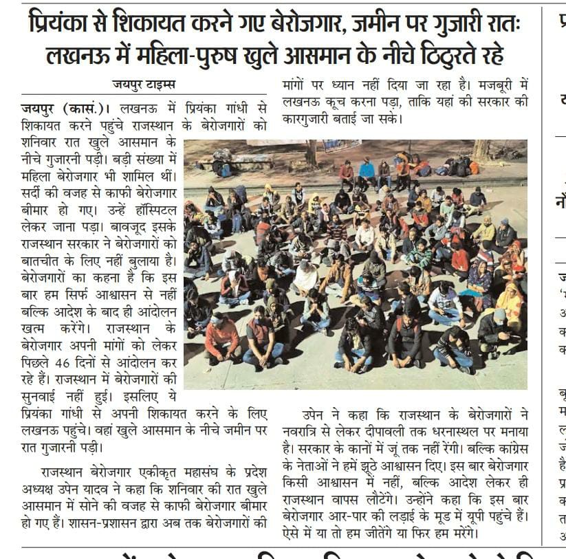 उपेन यादव ने अखबार में छपी खबरों की कुछ तस्वीरें भी शेयर की थीं. इन तस्वीरों में से एक तस्वीर में देखा जा सकता है यही लोग सड़क किनारे बैठे हैं न कि सो रहे हैं. ये तस्वीर दैनिक भास्कर की एक रिपोर्ट की है. आर्टिकल के अनुसार, राजस्थान के बेरोज़गार पुरुष और महिलाएं पिछले 46 दिनों से विरोध प्रदर्शन कर रहे हैं. शनिवार को इन युवाओं ने लखनऊ में कांग्रेस मुख्यालय के बाहर धरना प्रदर्शन करते हुए ठंड में रात गुज़ारी थी.